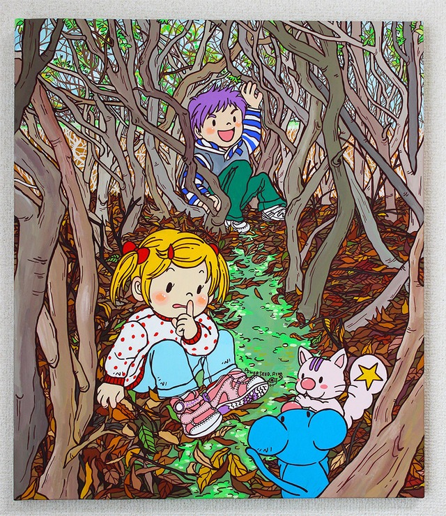 物語:かくれんぼしていたら・・・発見っ!子どもだけが通れる秘密のトンネル! 大人は入ってこれないんだよ・・・だからパパやママに叱られた時はここにかくれようと思う。 落ち葉の絨毯に木の枝でできた屋根。トンネルでもあるけど・・・ここは子どもしか入れない「秘密基地」でもあるね! サイズ:F10号(530×455) 素材:キャンバス、アクリルガッシュ 制作年:2021年 額縁:額縁は付属しません(キャンバス本体のみ)