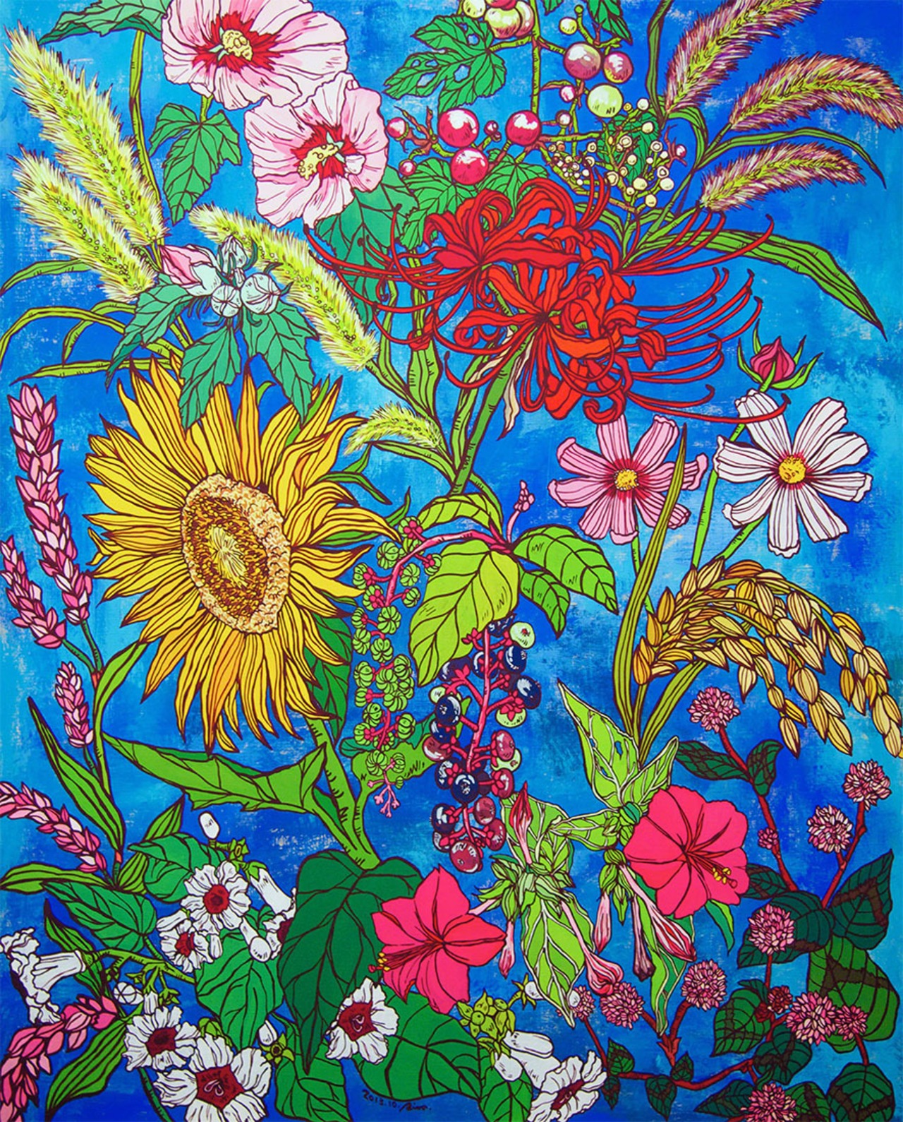 背景の鮮やかな瑠璃色(るりいろ)は、深まる秋の空や、命を燃やす植物たちの熱量を表現しています。ひまわり、彼岸花、そして様々な穂や実が、時に互いに絡み合い、空間を埋め尽くすように密集している姿も見かけます。一つ一つの植物が、懸命に生きるさまが織りなす「生命のドラマ」です。