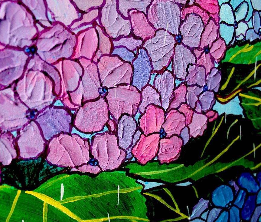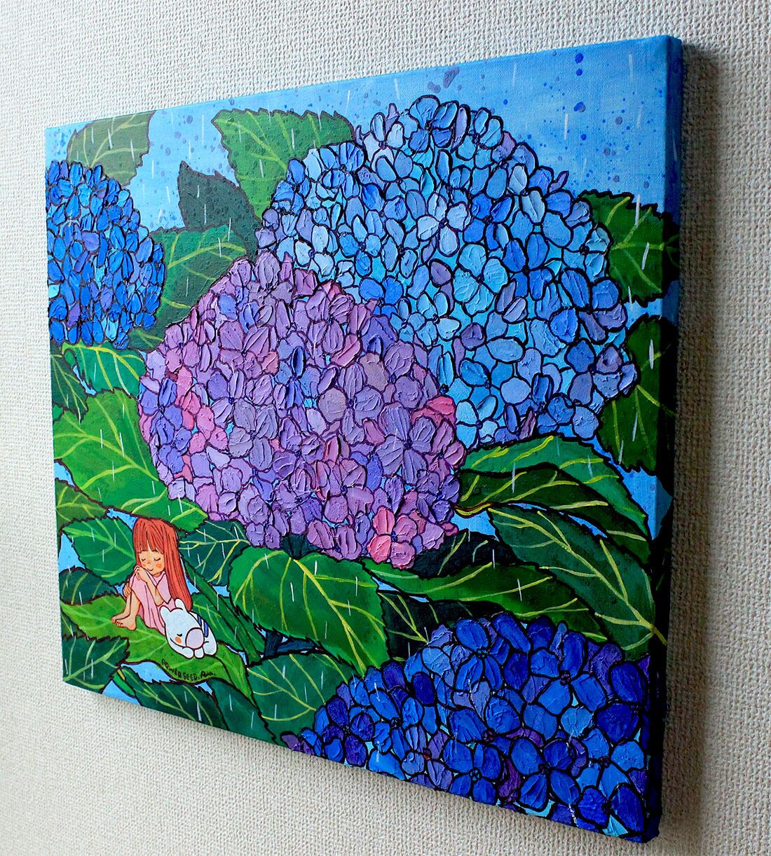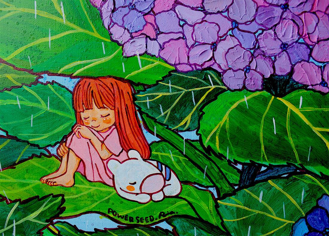 雨に濡れてイキイキと咲き誇る紫陽花を青と紫で大きく描いていますが、その葉陰で一人の少女がしまブタと共に丸くなり、静かに目を閉じています。