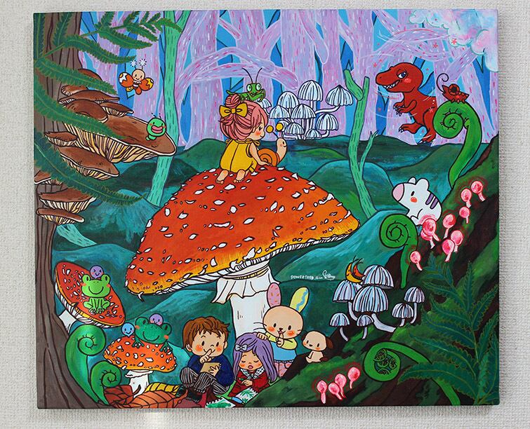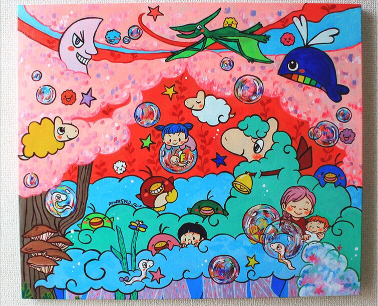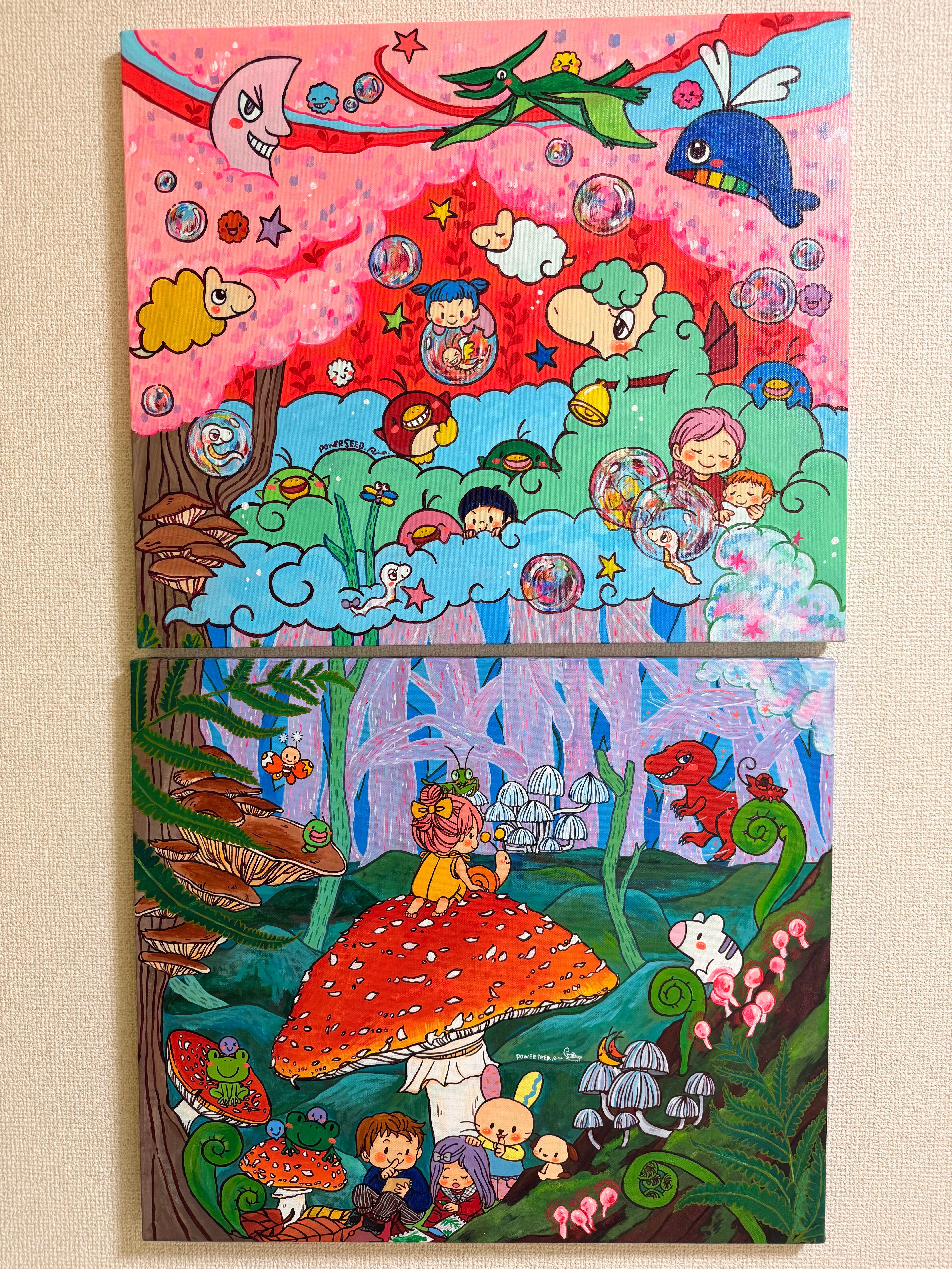 この森のキノコが出す胞子(ケムリ)には幻想を映し出す力があり、そのケムリが消えるまでは、いろんなものが見えてくる。今日はティラノサウルスがお目見えです。その森を上へ上へと空高く抜けていくと、そこには雲でできた庭が広がっています。ここは泡を身に纏った「泡パカ」が住んでおり、雲の上にはシャボン玉がたくさん飛んでいる。ふわりふわりと柔らかい雲や泡に包まれて、ゆりかごのように眠くなってしまう。