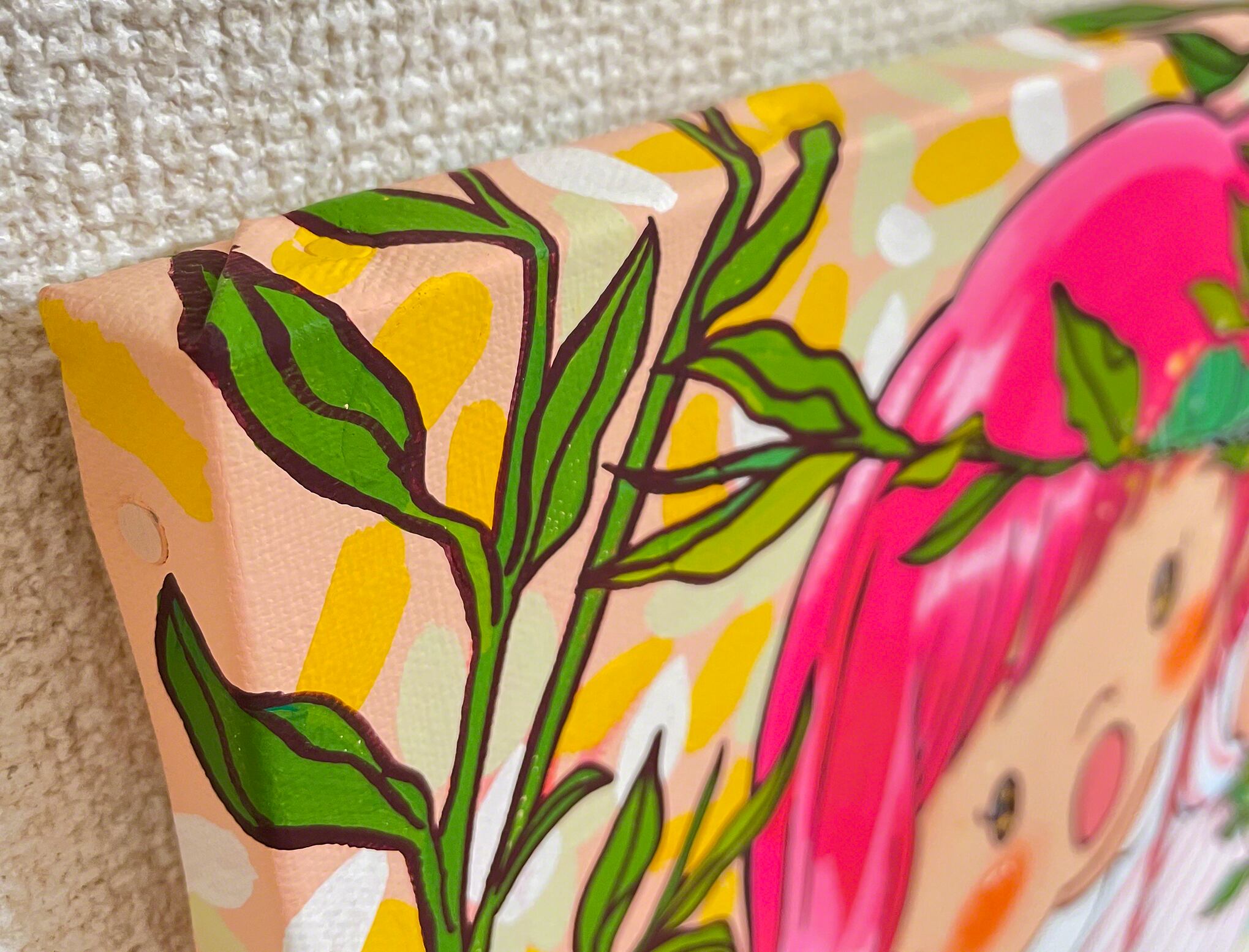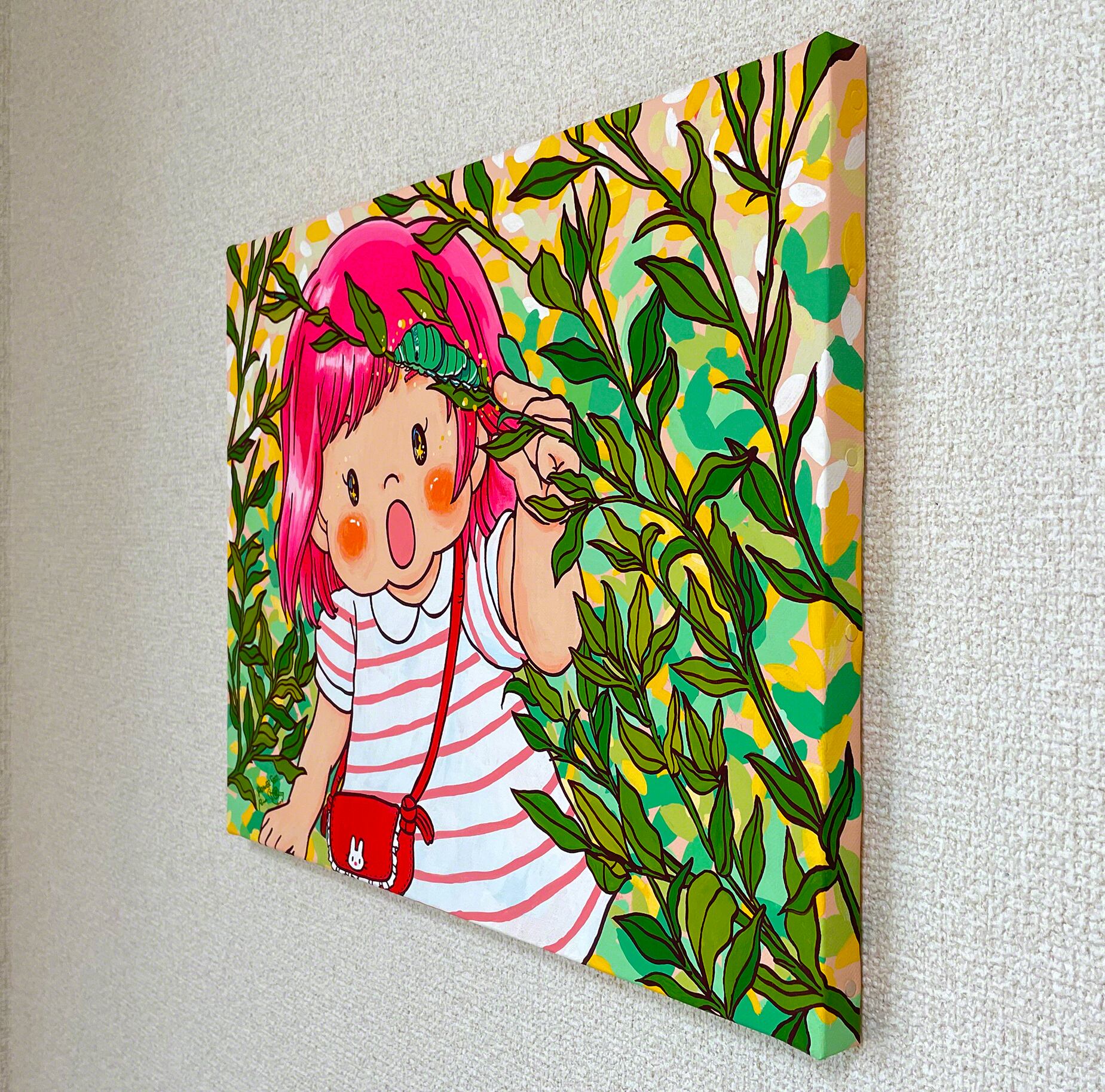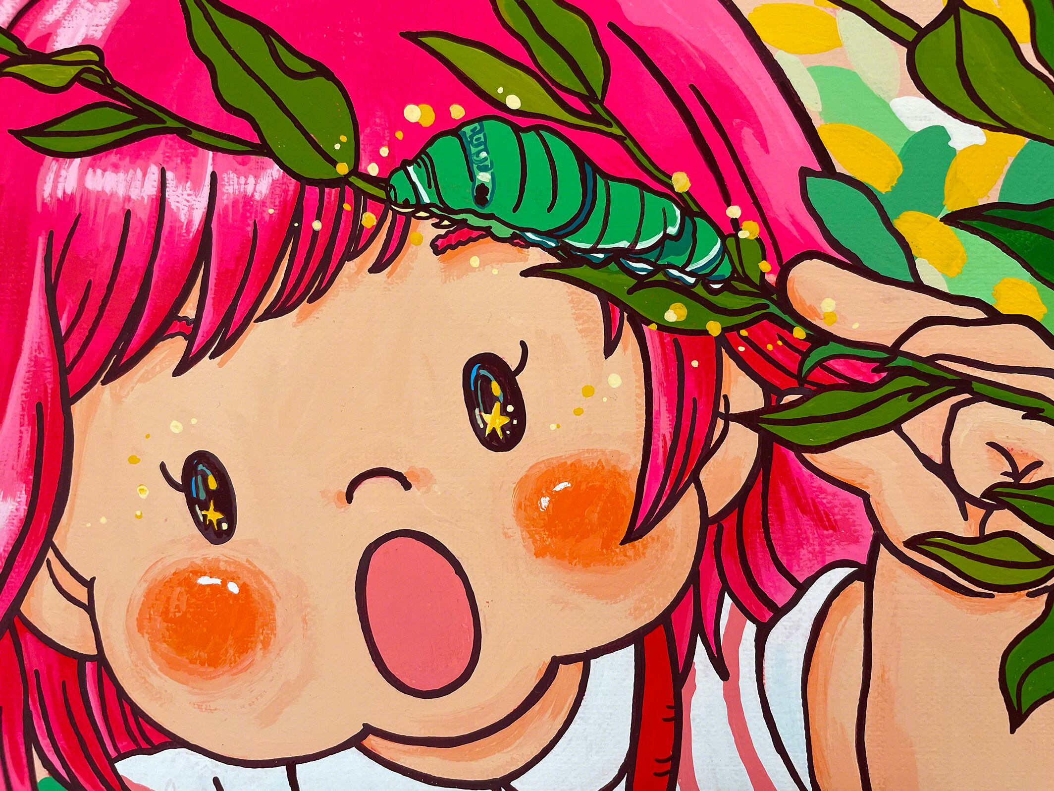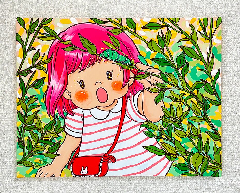 茂る緑の中で幼虫を見つめる瞳には、好奇心と驚きが入り混じった星の輝きが宿ります。紅潮した頬と開いた口元からあふれる興奮と喜びは、純粋な「発見」の感動そのもの。子どもの瑞々しい感性と、心が躍る生き生きとした様子を表現しています。